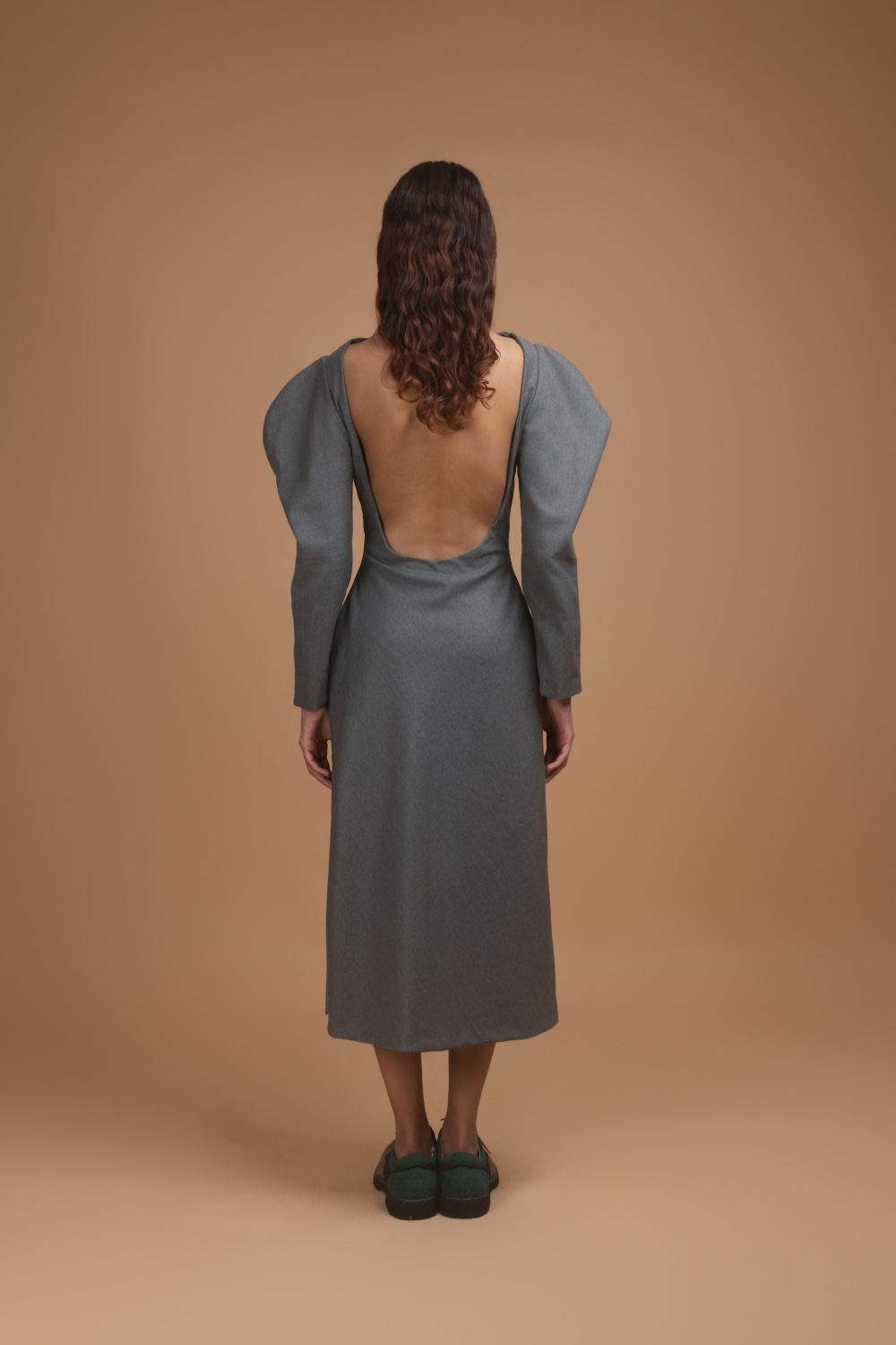 The Slate Solstice Dress is a striking balance of structure and sensuality. Crafted in a muted grey suiting fabric, it features sculptural, voluminous sleeves and a demure high neckline in the front, contrasted boldly with a dramatic open back. The dress speaks to a quiet power—sophisticated, sculptural, and unapologetically modern.