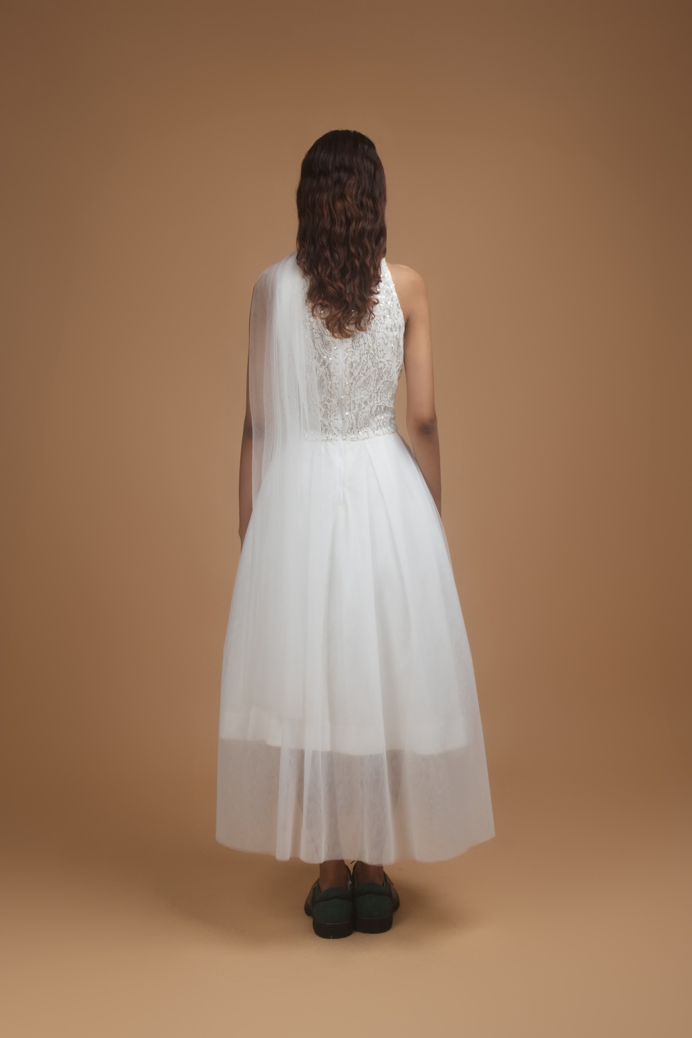 The Swan’s Pause Dress is a wistful ode to ethereal elegance and quiet rebellion. Crafted from delicate layers of soft white tulle, the dress features a fitted bodice encrusted with shimmering sequins and intricate lacework that glints like moonlight on still water. A sheer tulle drape falls gently from the neckline, creating a poetic silhouette that moves with air-light grace. The calf-grazing hemline balances romance with restraint, while the contrast of structured black oxford shoes infuses the look with a grounded, contemporary edge.